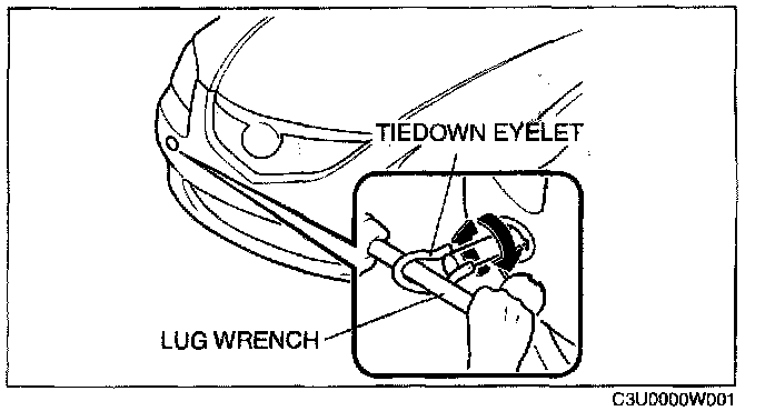 - If the tie down eyelet is not securely tightened, it may loosen or disengage from the bumper when tying down the vehicle. Make sure that the tie down eyelet is securely tightened to the bumper.