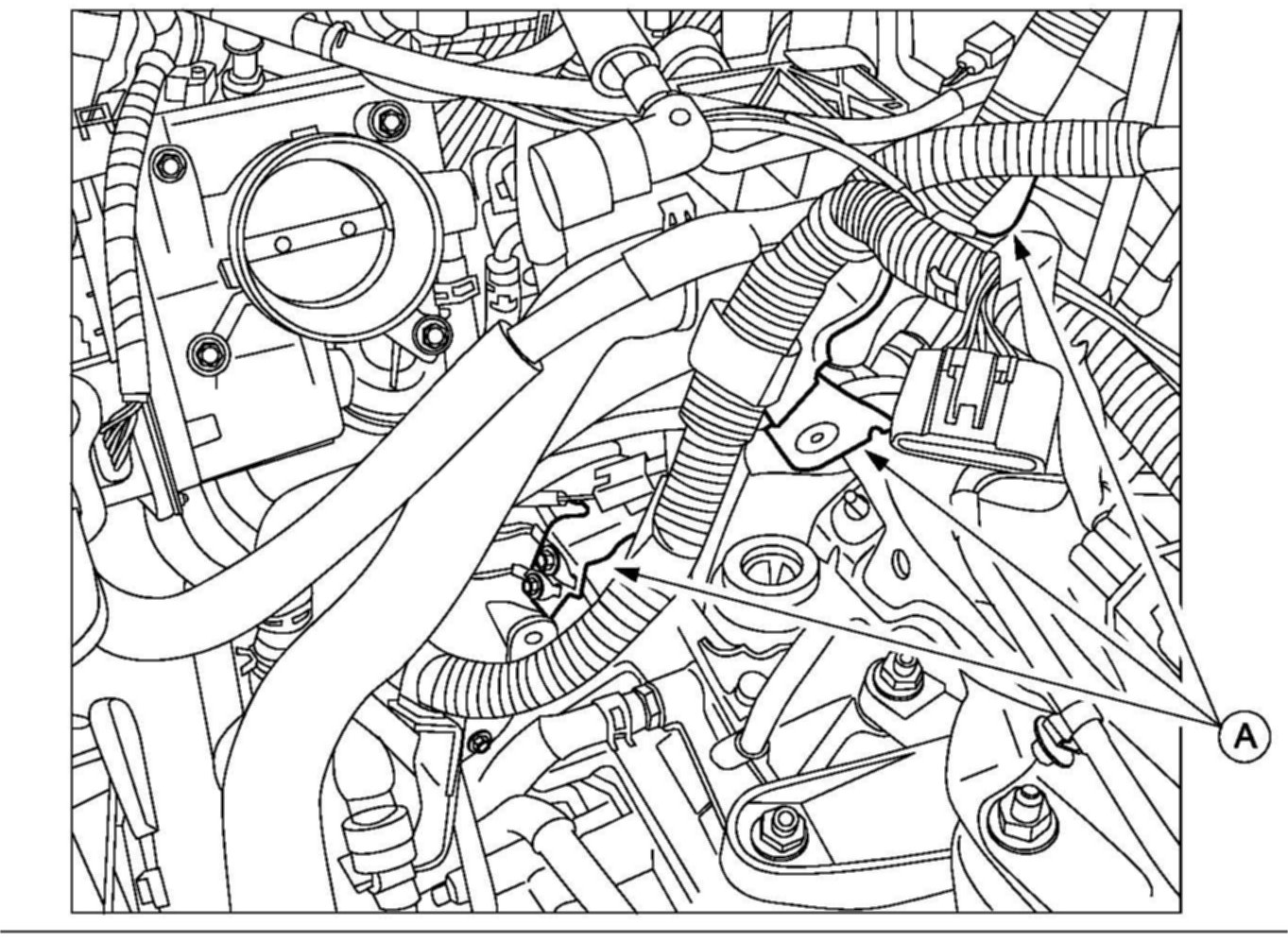 5. Loosen the bolts on the brackets (A) for the engine harness.