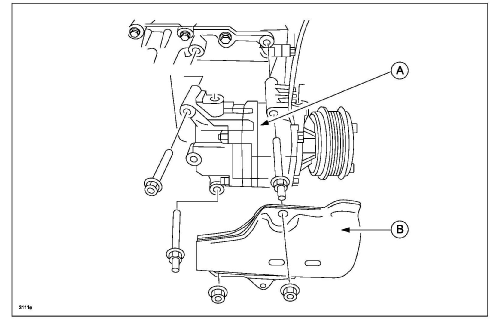 11. Remove the A/C compressor (A) after removing the protector (B).