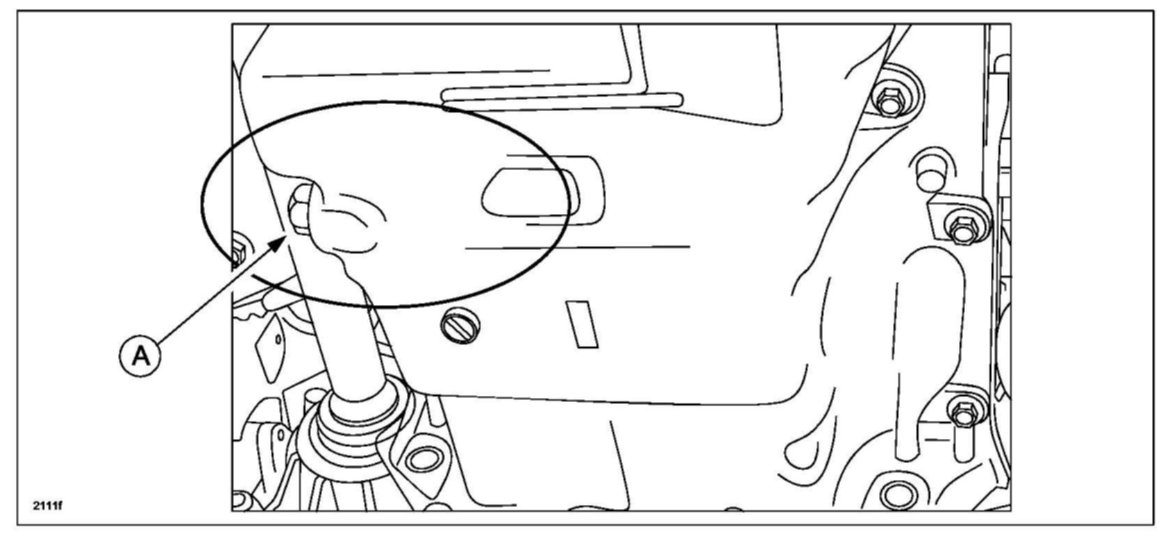 12. Using a 17 mm wrench, remove the drain plug (A) from the oil pan and drain the engine oil.