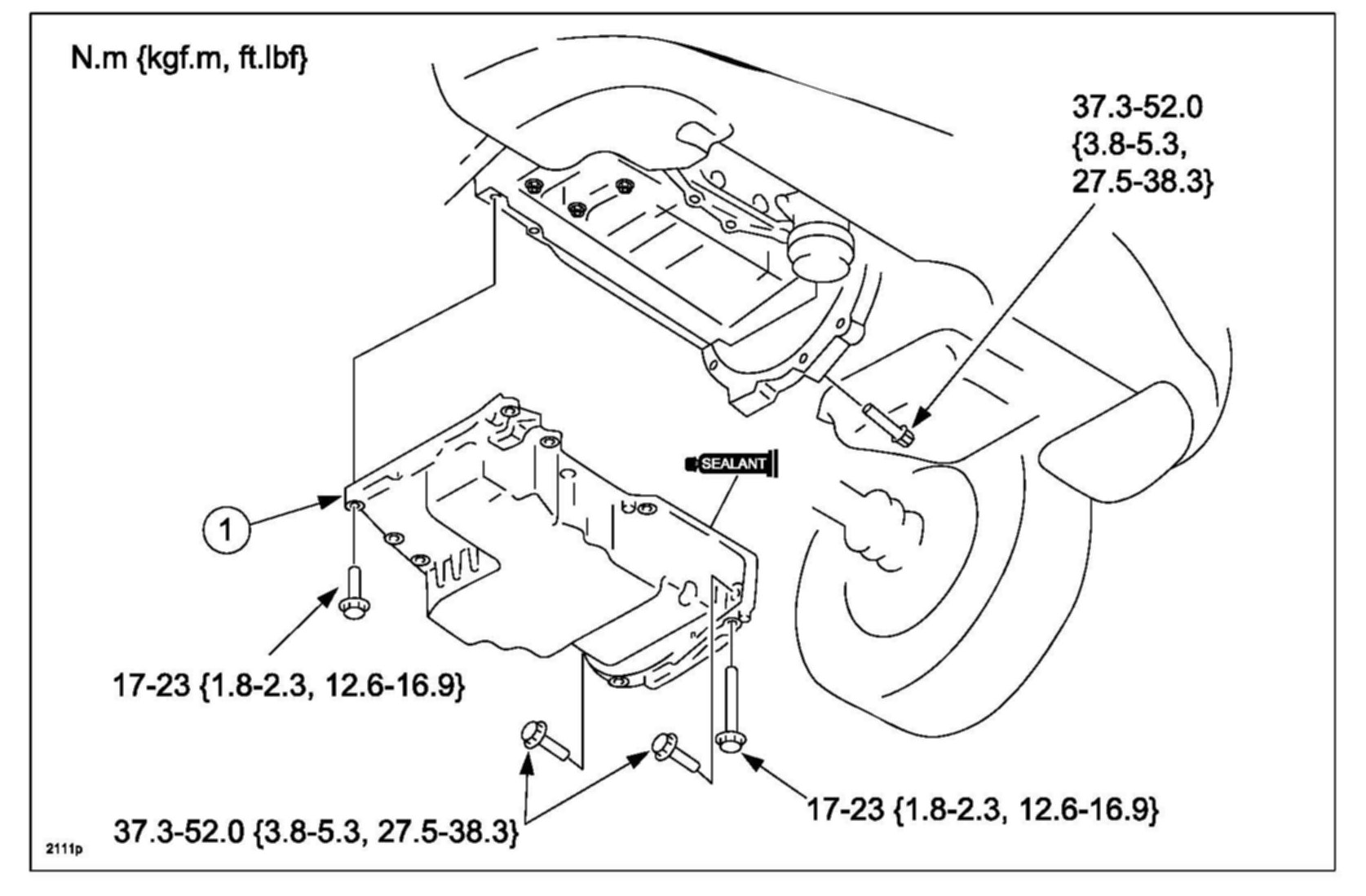 c. Tighten the No. 6, No. 7, No. 8 and No. 9 oil pan bolts to 17.0-23.0 N.m (12.5-17 ft-lb).