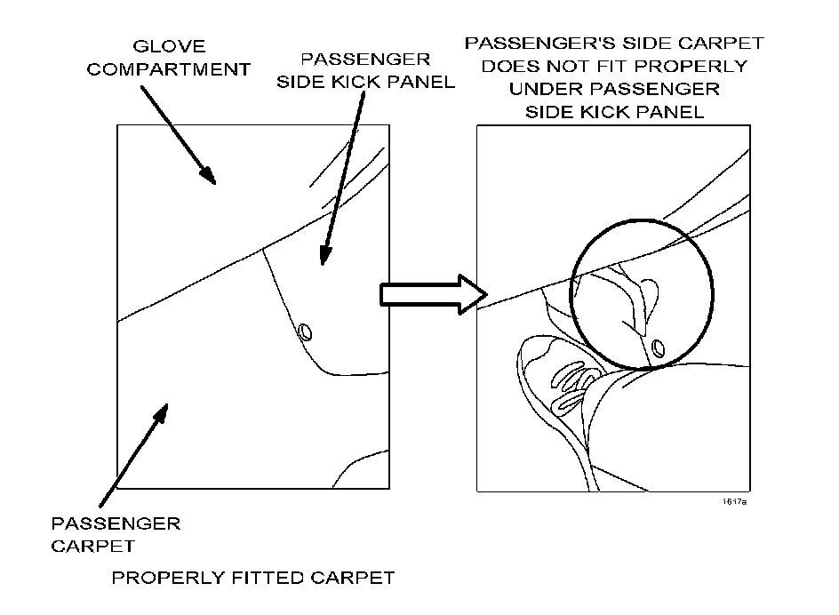 Some vehicles may experience poor fitting carpet in the passenger footwell area where the carpet bunches up and pulls out from under the passenger's front side trim (kick panel). There is a gap between the dash insulator pad and the carpet and when the carpet is pressed down, it moves out of position and pulls out from under the front side trim.