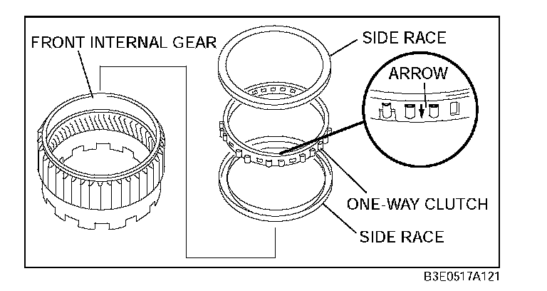 Install the one-way clutch to the front internal gear in the direction of the arrow (on the one-way clutch) as shown in the figure.