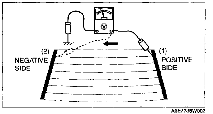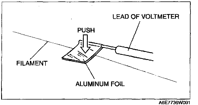 CAUTION: Directly touching the rear window defroster filament with the lead of the tester could damage it. Wrap aluminum foil around the end of the lead and inspect the filament by touching it with the foil.