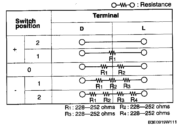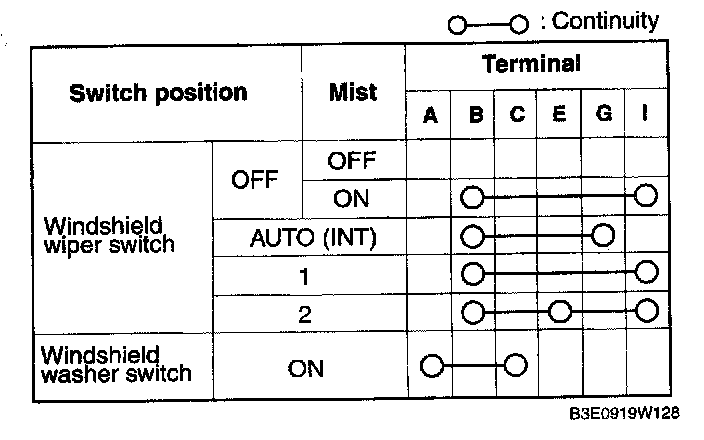 Verify that the continuity between the windshield wiper and washer switch is as indicated in the table.