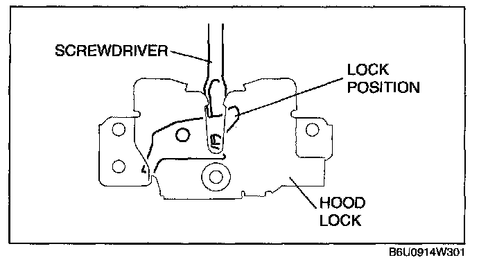 6. Lock the hood lock using a flathead screwdriver or equivalent as shown.