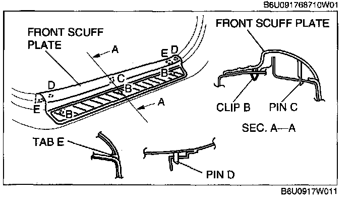 upward, disengage clips B, pins C, D and tabs E from the body, and remove the front scuff plate.