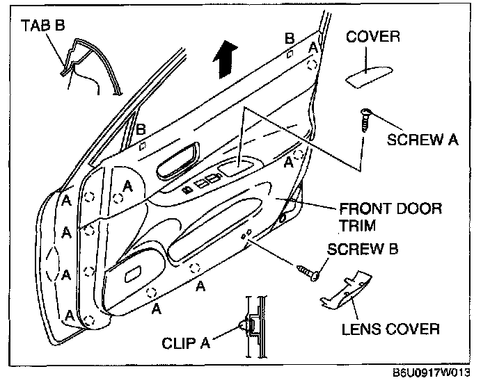 8. Pull the front door trim upward, then disengage tabs B from the front door.