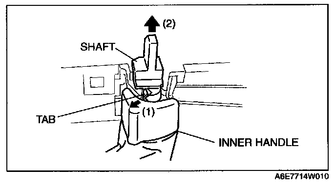 2. Using a flathead screwdriver, press and hold the tab in the direction indicated by arrow (1), and remove the shaft by pulling it in the direction indicated by arrow (2).