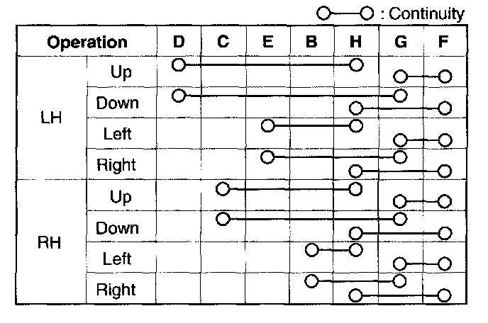 Inspect for continuity between the power outside mirror switch terminals using an ohmmeter.