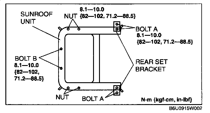 7. Remove bolts B and nuts, and then remove the sunroof unit.