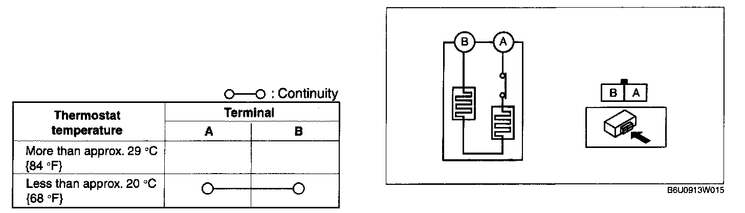 3. While inspecting for continuity between the connector terminals A and B, use a dryer to warm the thermostat of the seat warmer unit on seat cushion.
