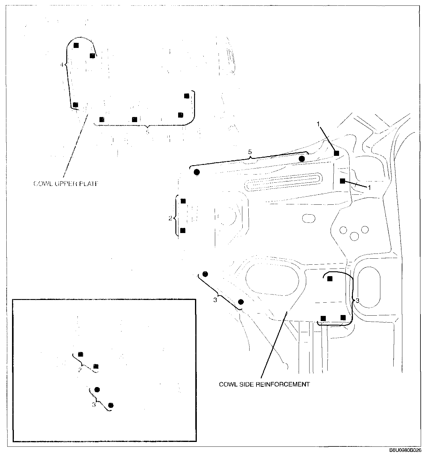 COWL SIDE REINFORCEMENT AND COWL UPPER PLATE REMOVAL1. Remove the cowl side reinforcement.