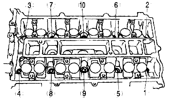 1. Loosen the cylinder head bolts in two or three steps in the order shown in the figure.