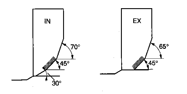 1 If the seating position is too out side, correct the valve seat using a 70° (IN) or 65° (EX) cutter, and a 45° cutter. (2) If the seating position is too inner side, correct the valve seat using a 30° (IN) cutter, and a 0° (EX) cutter, and a 45° cutter.