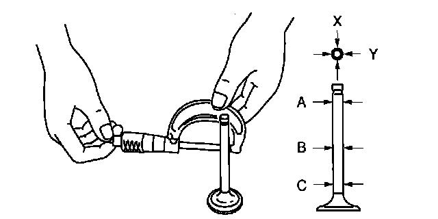 3. Measure the stem diameter of each valve in X and Y directions at the three points (A, B. and C) as indicated in the figure.