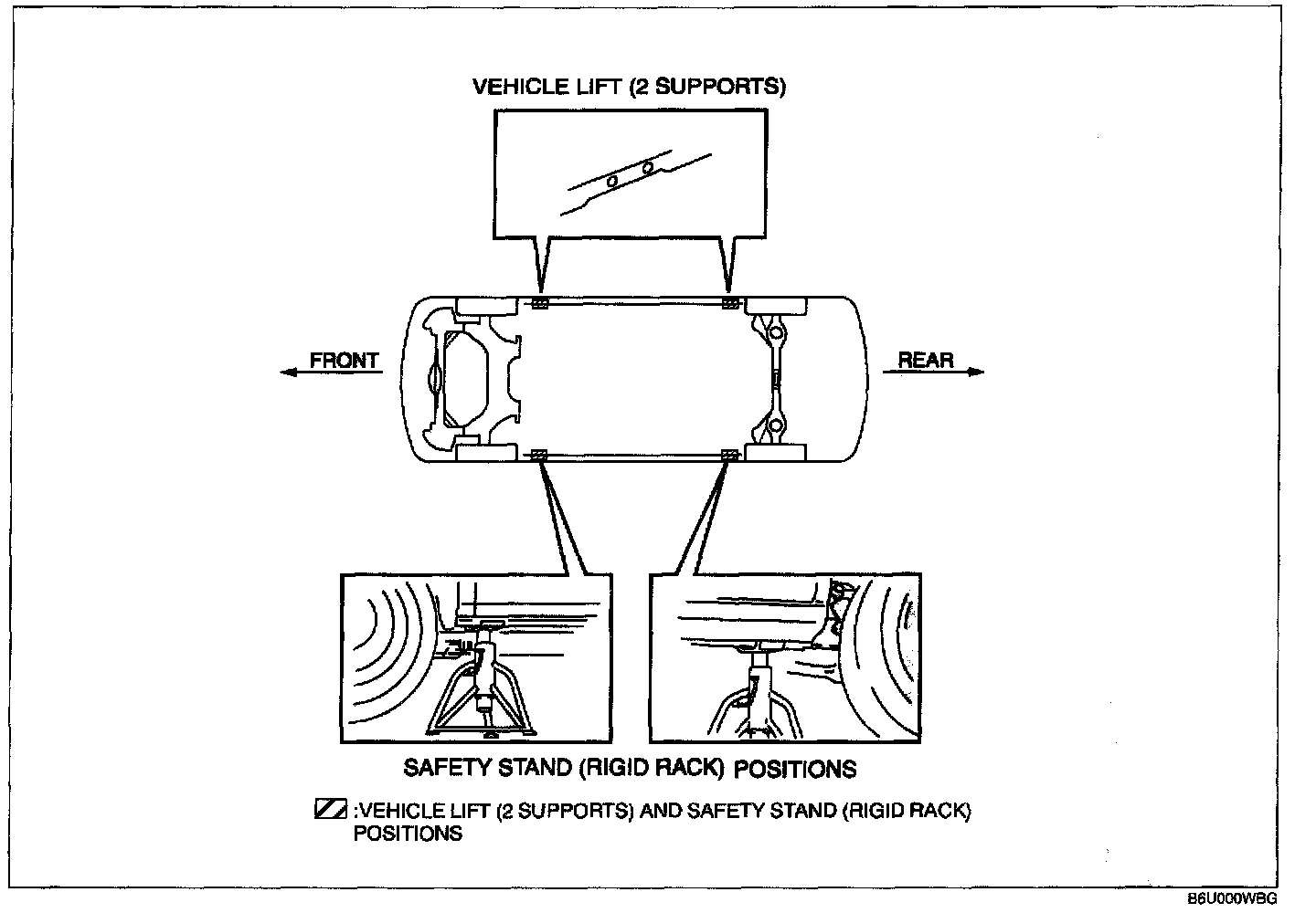 JACKING POSITIONS, VEHICLE LIFT (2 SUPPORTS) AND SAFETY STAND (RIGID RACK) POSITIONSJacking Positions