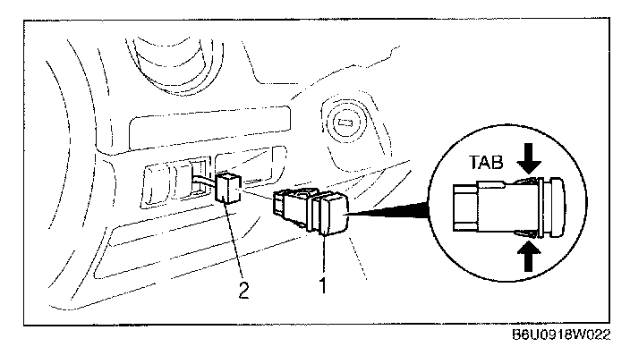 1. Insert your hand from the lower side of the dashboard and squeeze the tabs of the panel light control switch.