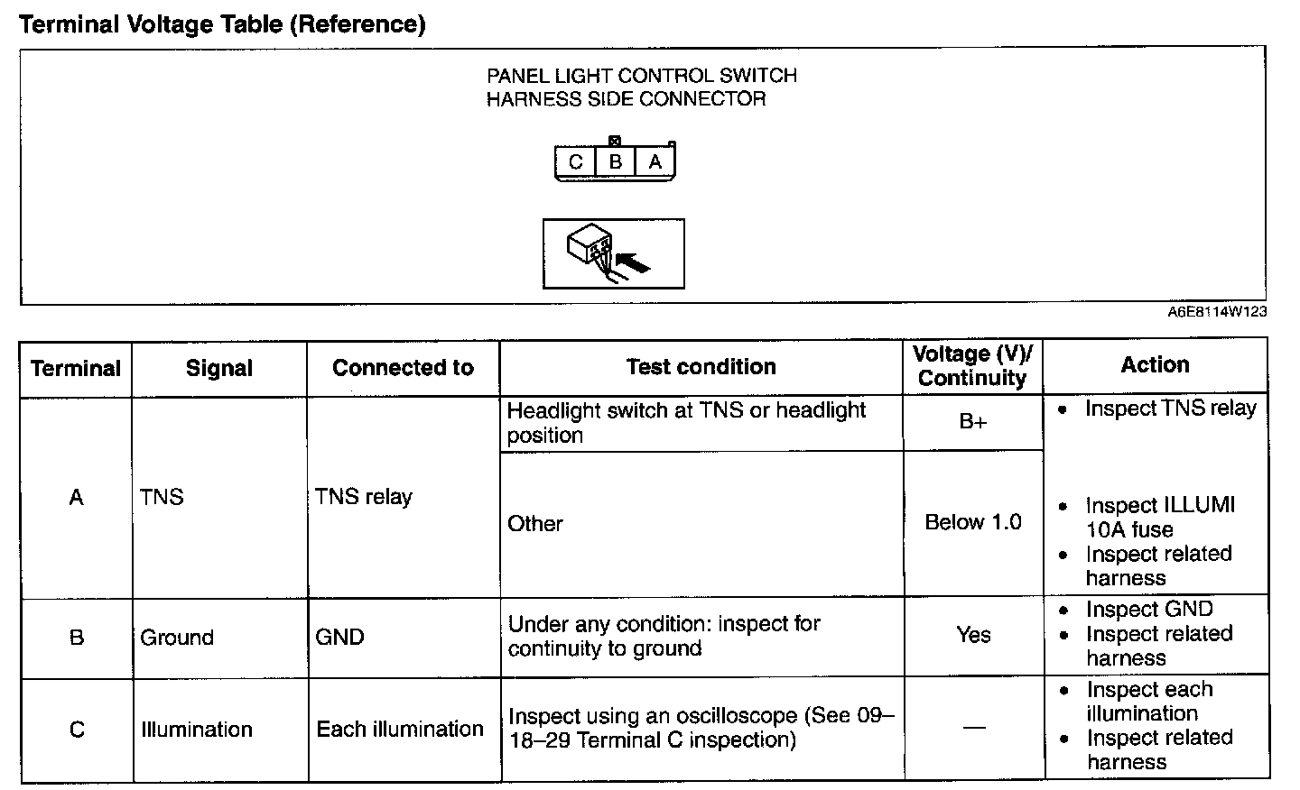 - When inspecting terminal B for continuity, disconnect the panel light control switch connector.