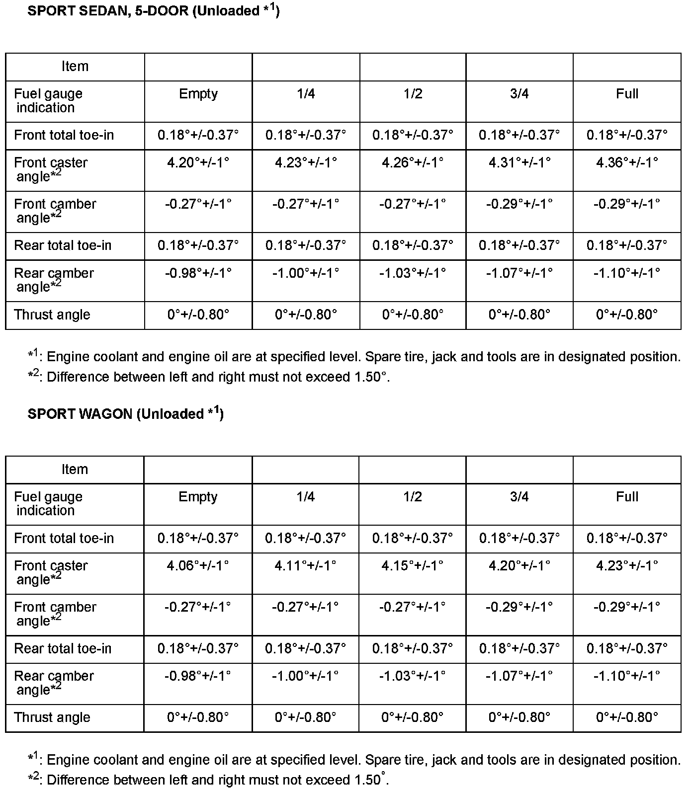 1. Perform 4-wheel alignment using the alignment specifications (alignment specs are in degrees) table above.