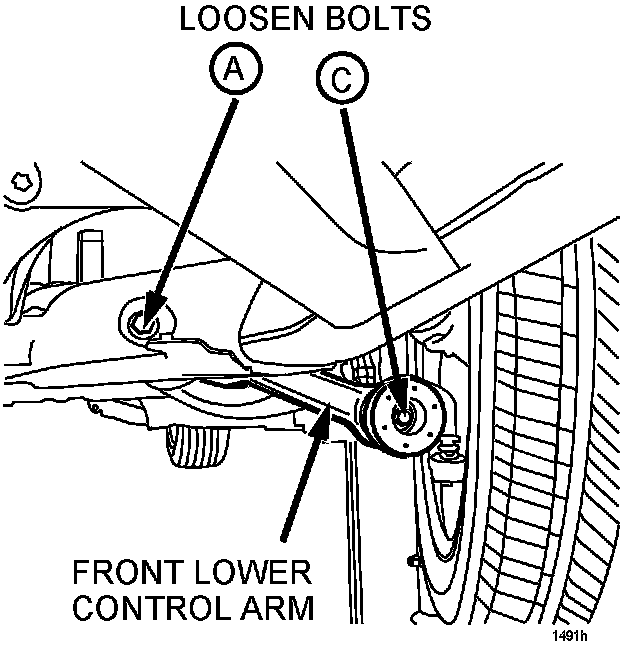 4. Loosen bolts "A" and "C" on both sides of front suspension.