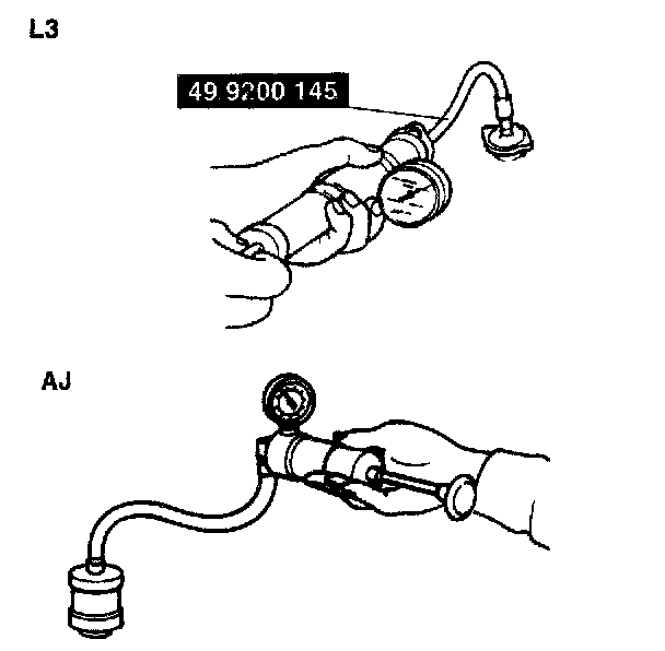 ^ Applying more than 127 kPa (1.3 kgf/cm2, 18 psi) (2.3L engine model), 107.9 kPa (1.1 kgf/cm2, 15.6 psi) (3.0L engine model), can damage the hoses, fittings, and other components, and cause leaks.