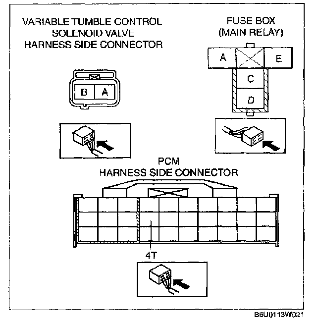 - Variable tumble control solenoid valve terminal B (harness-side) and PCM terminal 4T
