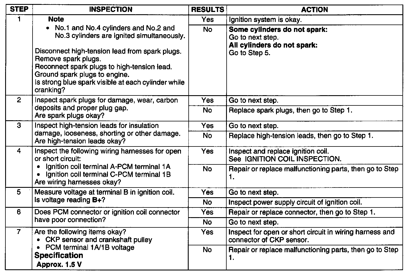 WARNING: High voltage in the ignition system can cause strong electrical shock which can result in serious injury. Avoid direct contact to the vehicle body during the following spark test.