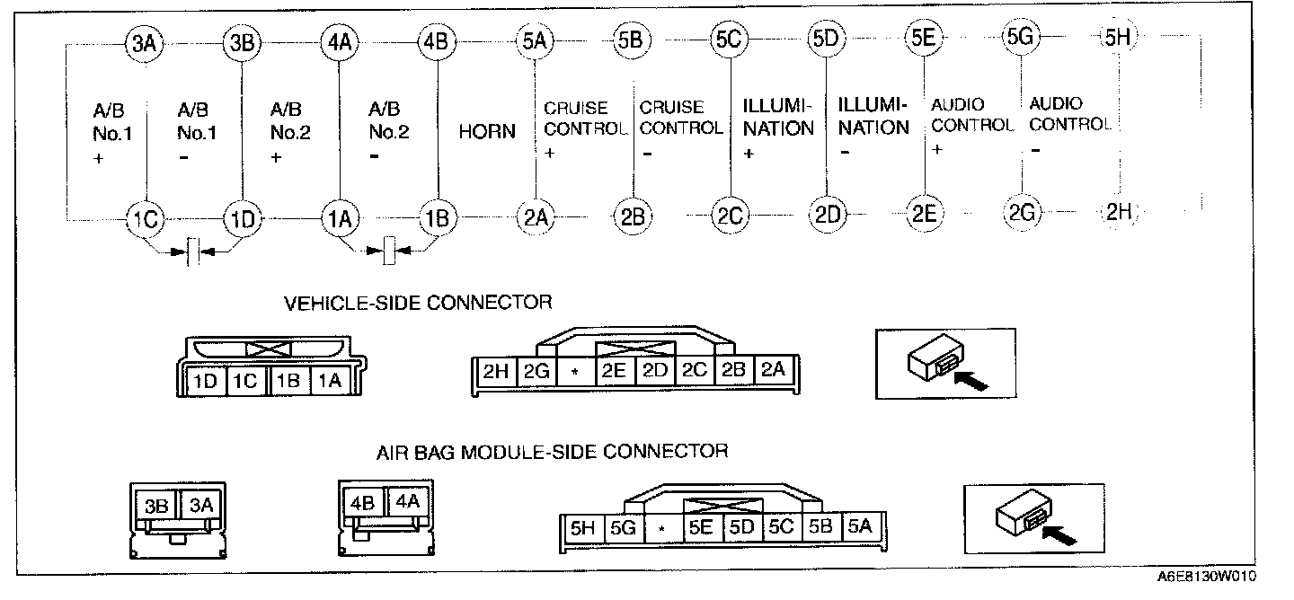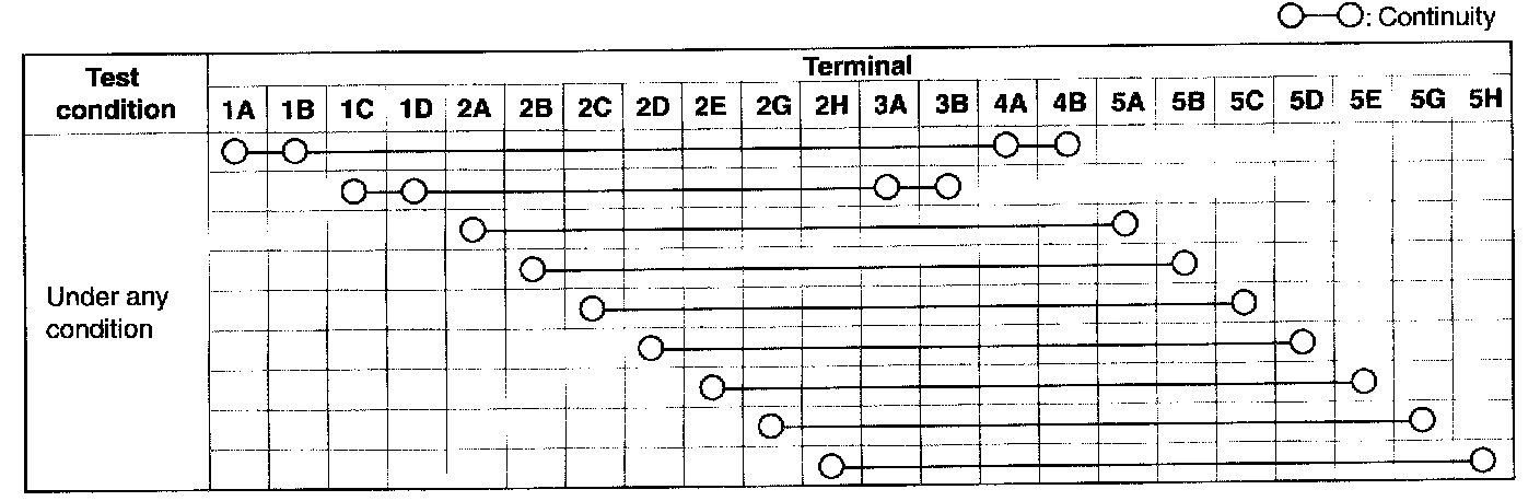 NOTE: When the vehicle-side connector of the clock spring is disconnected, terminals 1A,1B, 1C and 1D are shorted to prevent unexpected deployment of the air bag module. When it is connected, the terminals are open.