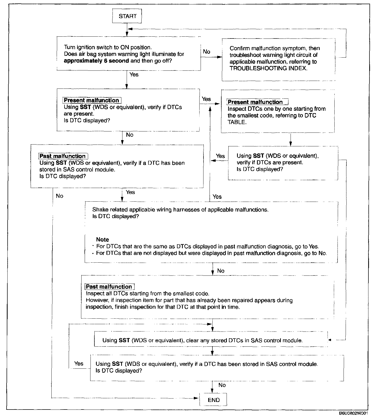 NOTE: When the air bag system is malfunctioning, turn the ignition switch to the ON position to display the current DTC, using the air bag system warning light on the instrument cluster. However this light is strictly for reference. Make sure to inspect the system, using the SST (WDS or equivalent).