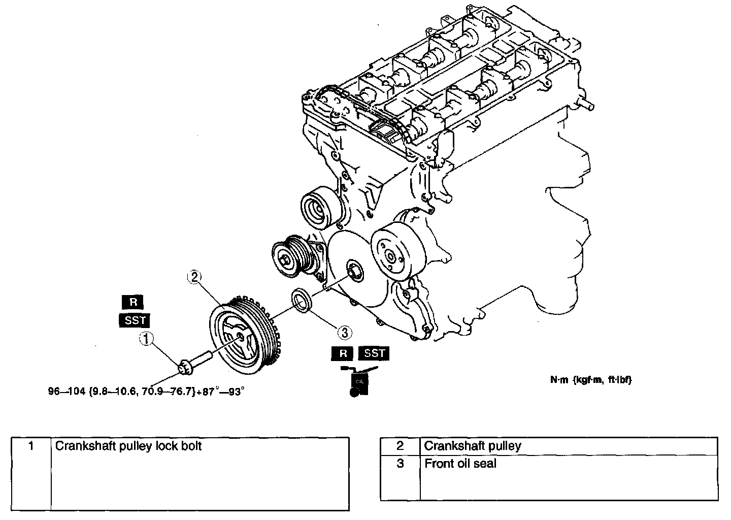 - Tighten the crankshaft pulley lock bolt in the order shown following two steps using the SST (49 D032 31 6).