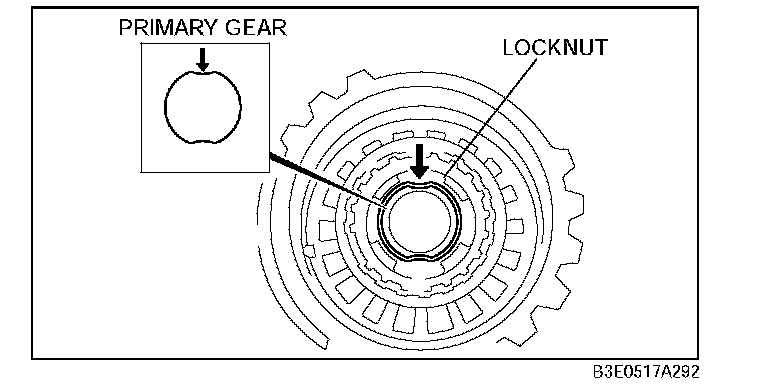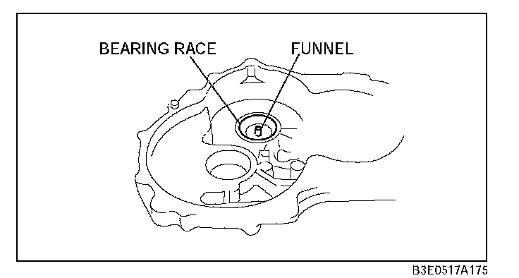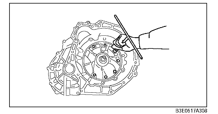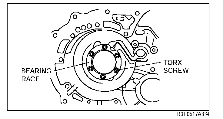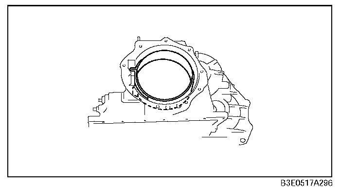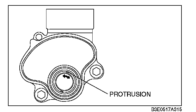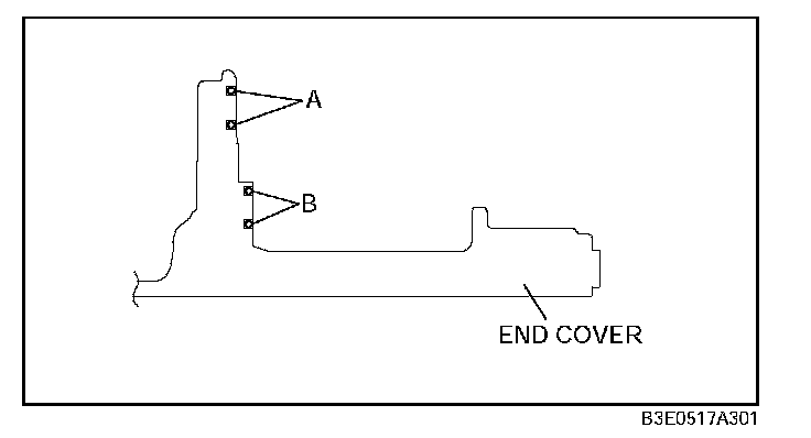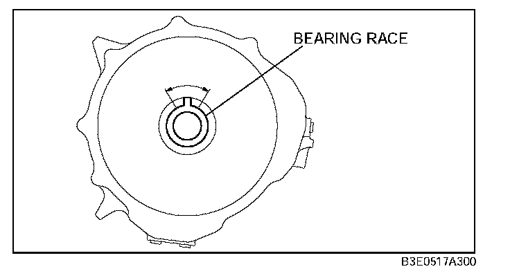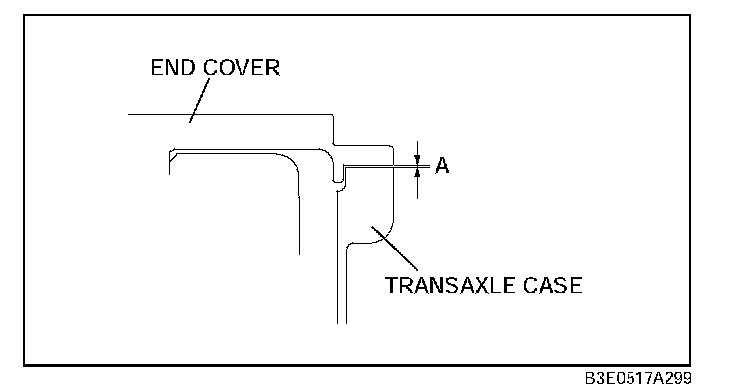 Caution: The bearing race and end cover may be damaged if the end cover is not installed correctly to the transaxle case. Align the projection of the bearing race within the area of the arrows shown in the figure, and then install the end cover to the transaxle case.