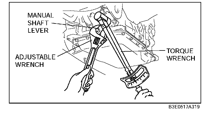 8) Set the adjustable wrench as shown to hold the manual shaft lever, and tighten the manual shaft nut.