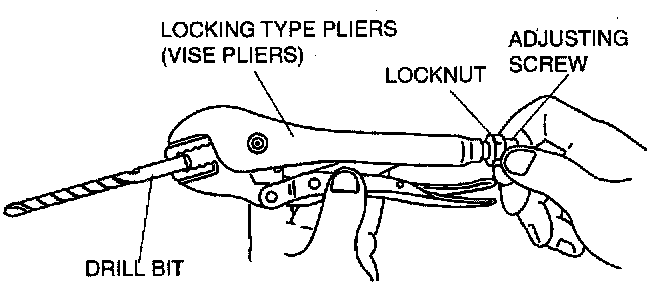 3. With the jaws of locking-type pliers (vise grips) closed and locked, turn the adjusting screw to position the jaws against the drill bit with the diameter measured (height) in the removal procedure 1. Tighten the lock nut on the adjusting screw against the handle to lock the adjustment in place.