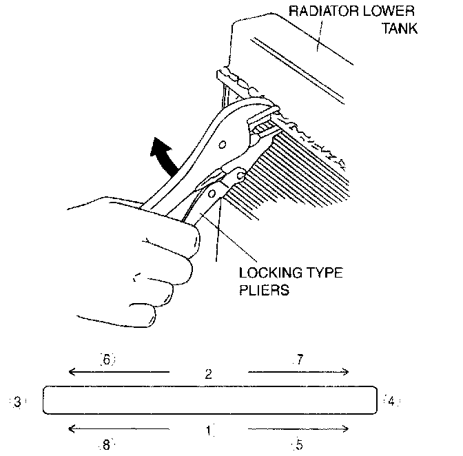 4. Squeeze the header tabs down in the order against the lip of the radiator outer tank base with the locking-type pliers while rotating the pliers toward the tank.