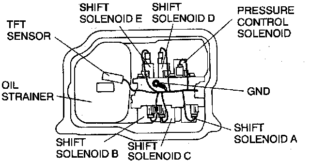 7. Disconnect the solenoid connectors and GND, and remove the TFT sensor.