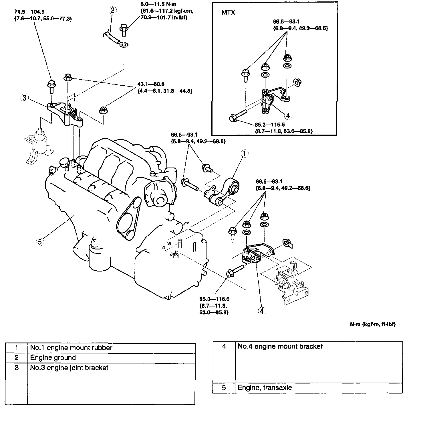 2, 3, 4 43.1 - 60.8 Nm (4.4 - 6.1 kgf-cm, 31.8 - 44.8 ft. lbs.)