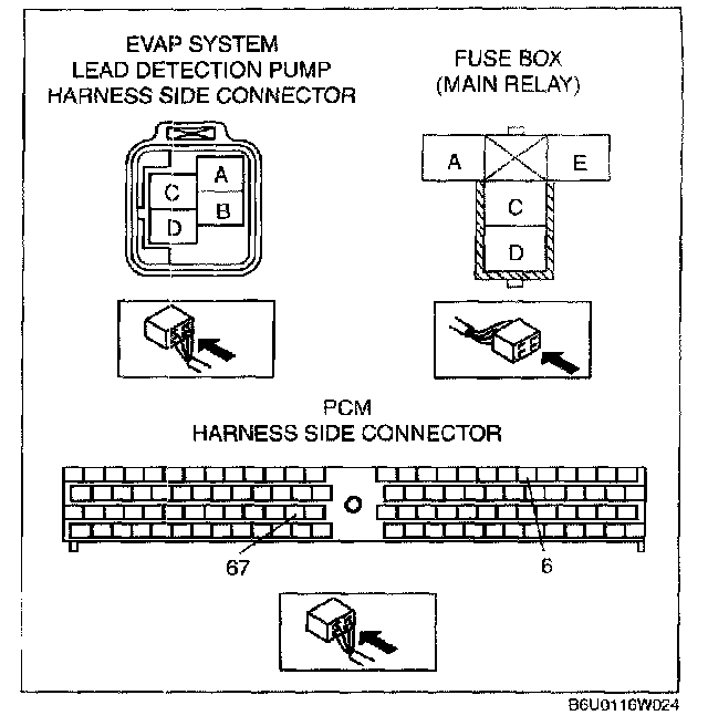 - EVAP system leak detection pump terminal D (harness-side) and PCM terminal 67