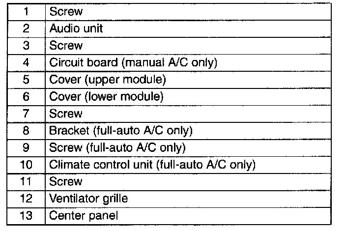 CENTER PANEL MODULE DISASSEMBLY/ASSEMBLYCAUTION: Before disassembling the center panel module, spread a cloth on the floor to put the disassembled parts on. This protects the surface of the panel from scratches or dirt.