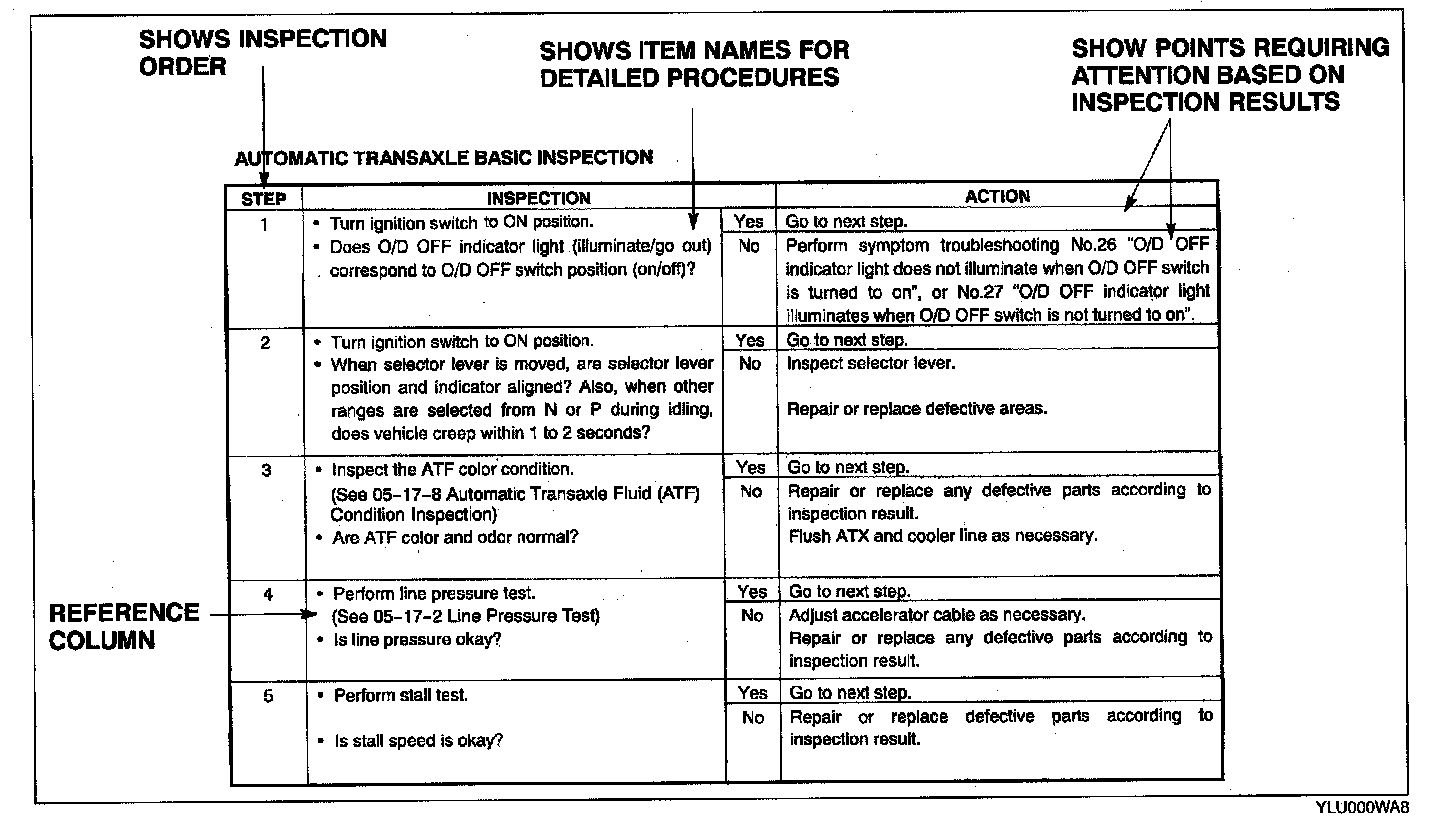 - Although inspections and adjustments are performed according to the reference column procedures, if the cause of the malfunction is discovered during basic inspection, continue the procedures as indicated in the action column.