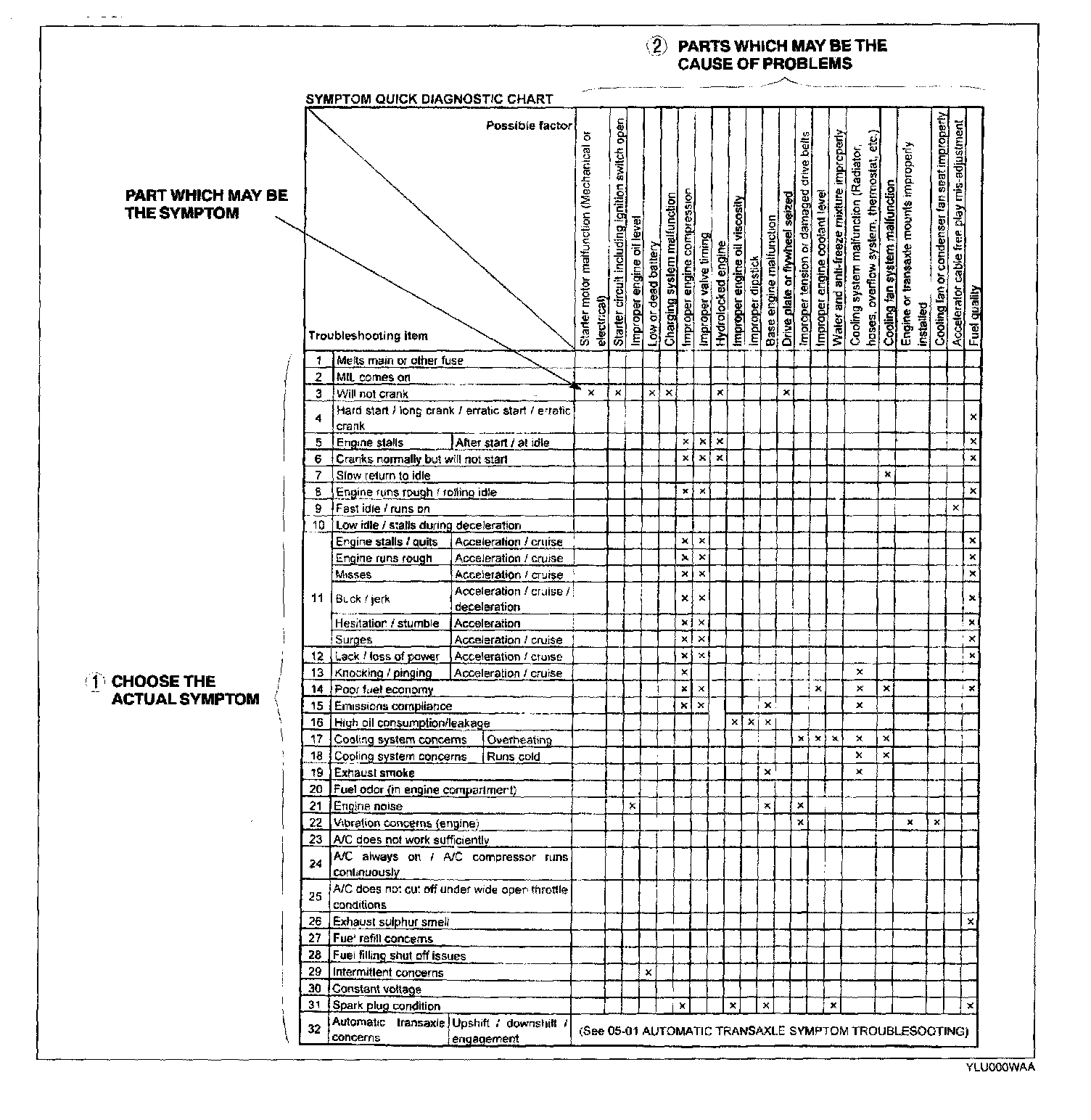 - The chart is effective in quickly narrowing down the relation between symptom and cause of the malfunction. It also specifies the area of the common cause when multiple malfunction symptoms occur.