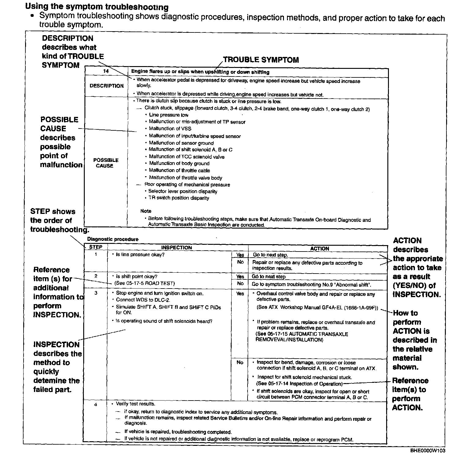- The appropriate diagnostic inspection relating to malfunction cause as specified by the symptoms can be selected by looking down the diagnostic inspection column of the chart.
