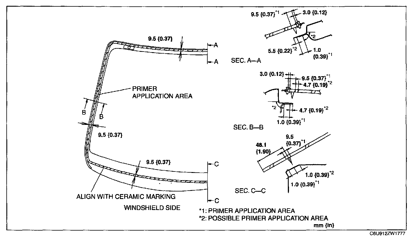 CAUTION: Keep the area free of dirt and grease, and do not touch the surface. Otherwise, the primer may not properly bond to the surface of the glass and body, which may cause leaks to occur.