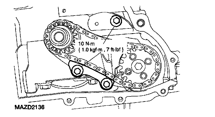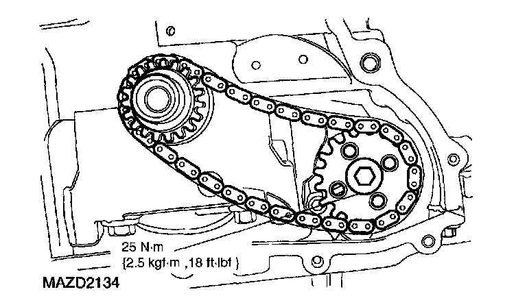 ^ The oil pump chain sprocket must be held in place.