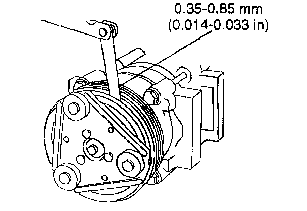 3. Add or remove spacers between the A/C clutch and the A/C clutch and the compressor shaft until clearance is within specification (0.35 - 0.85 mm, 0.014 - 0.033 in).