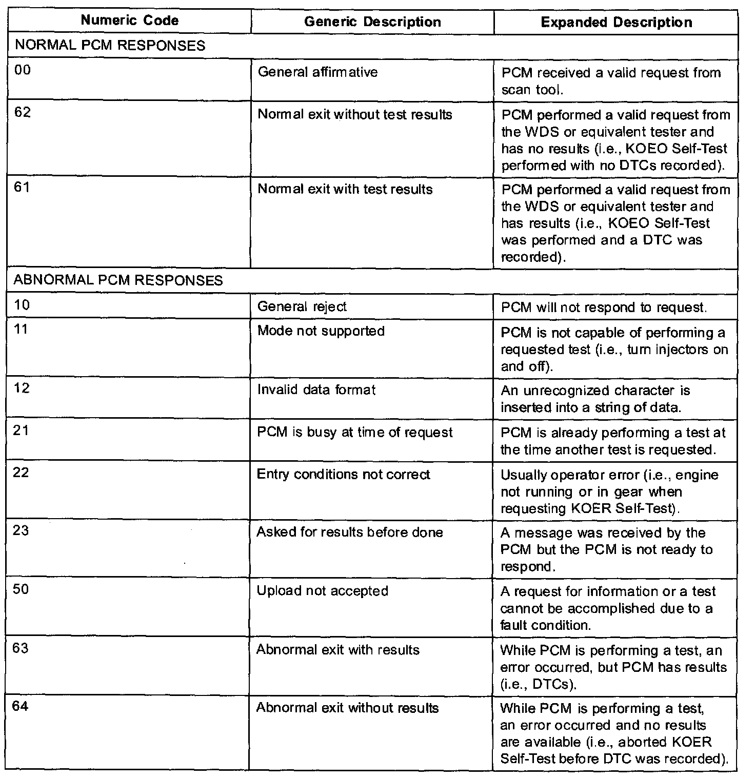 It is possible to receive a communication error from a WDS or equivalent tester when initiating a diagnostic test or accessing PIDs. The communication error can be caused by operator error, the vehicle wiring, connectors, the PCM or other control modules connected to the DLC wiring. The PCM will respond to a WDS or equivalent tester whenever the tool requests a test. These are not DTCs Listed are numeric codes and generic descriptions that a scan tool may display when trying to perform some PCM operations. It is possible to get other numeric codes not listed. For a complete list of communication response codes, See Society of Automotive Engineers (SAE) document J2190 enhanced E/E Diagnostic Test Modes Some are normal responses to valid requests. The others are communication error responses. If the tool displays any of the communication error responses check scan tool connections, cable/adapters and entry of vehicle information.