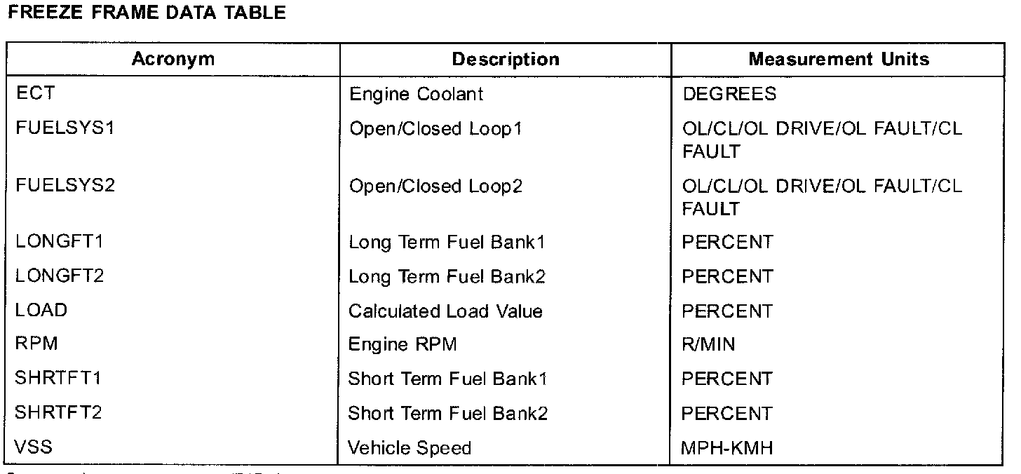 Freeze Frame Data allows access to emission-related values from specific generic PIDs. These values are stored when an emission-related DTC is stored in Continuous Memory. This provides a snapshot of the conditions that were present when the DTC was stored. Once one set of freeze frame data is stored, this data will remain in memory even if another emission-related DTC is stored, with the exception of Misfire or Fuel System DTCs Once freeze frame data for Misfire or Fuel System DTC is stored, it will overwrite any previous data, and freeze frame will not be further overwritten. When a DTC associated with the freeze frame is erased or a PCM memory reset is performed, new freeze frame data can be stored again. In the event of multiple emission-related DTCs in memory, always note the DTC for the freeze frame data.