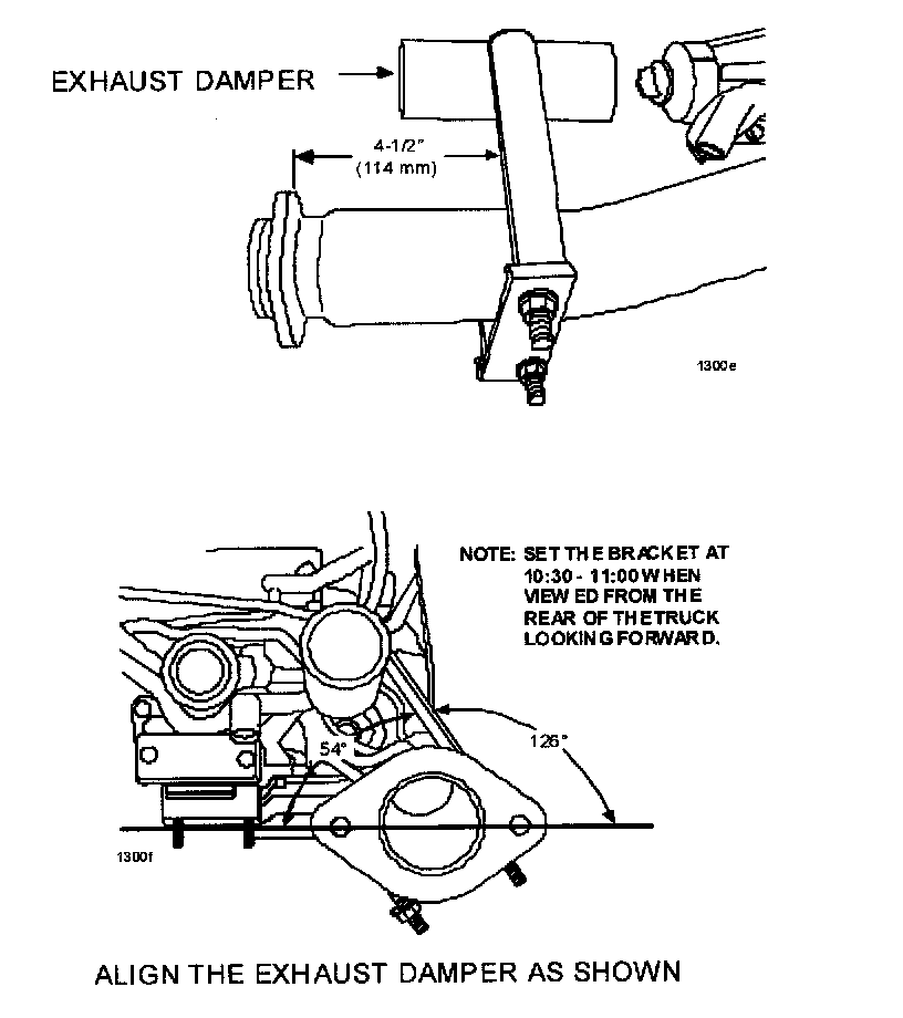 7. Check for the proper installation of the exhaust damper in front of the catalytic converter to muffler and exhaust pipe connection. The damper should be located 114 mm (4.5") forward of the catalytic converter flange and at an angle of 54 degrees from horizontal. Torque the exhaust damper attaching nuts - Tightening Torque: 47.5 N.m (35 lb-ft).