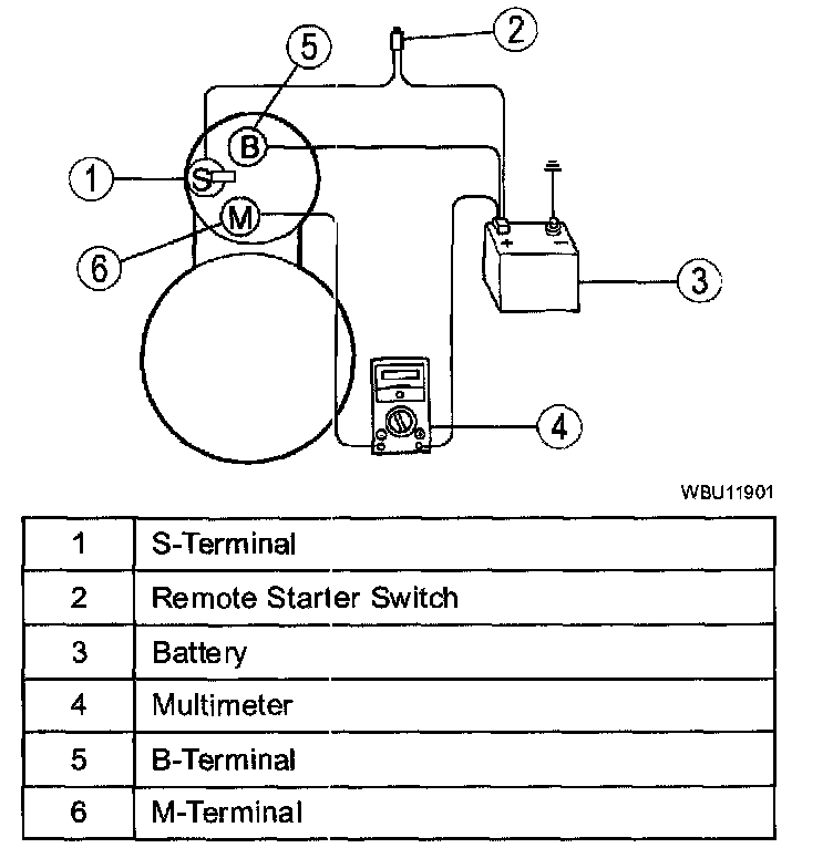 8. Remove the cables from solenoid B-, S- and M-terminals. Clean the cables and connections and reinstall the cables to the proper terminals. Repeat Steps 3 through 6. If the voltage drop reading is still greater than 0.5 volts when checked at the M-terminal or less than 0.5 volts when checked at the B-terminal, the concern is in the solenoid contacts. Replace the starter motor.