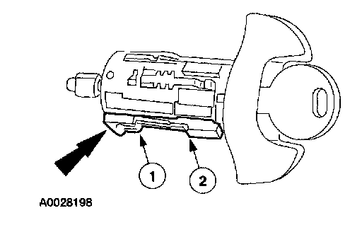 3. Remove the key warning switch by prying the clip (1) down and pushing the key warning switch (2) off the rear of the ignition lock cylinder.